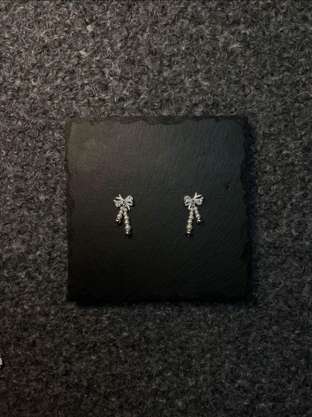 These stud earrings have a silver base and are exquisitely crafted into a bowknot shape, inlaid with shining diamonds, showing gorgeousness and delicacy. Below the bowknot, several round pearls dangle, adding elegance and sweetness. The overall design combines romantic bowknot elements, dazzling diamonds, and warm pearls. It is very suitable for wearing on occasions such as dates and parties, adding highlights to the outfit and showing the wearer's sweetness and nobility.