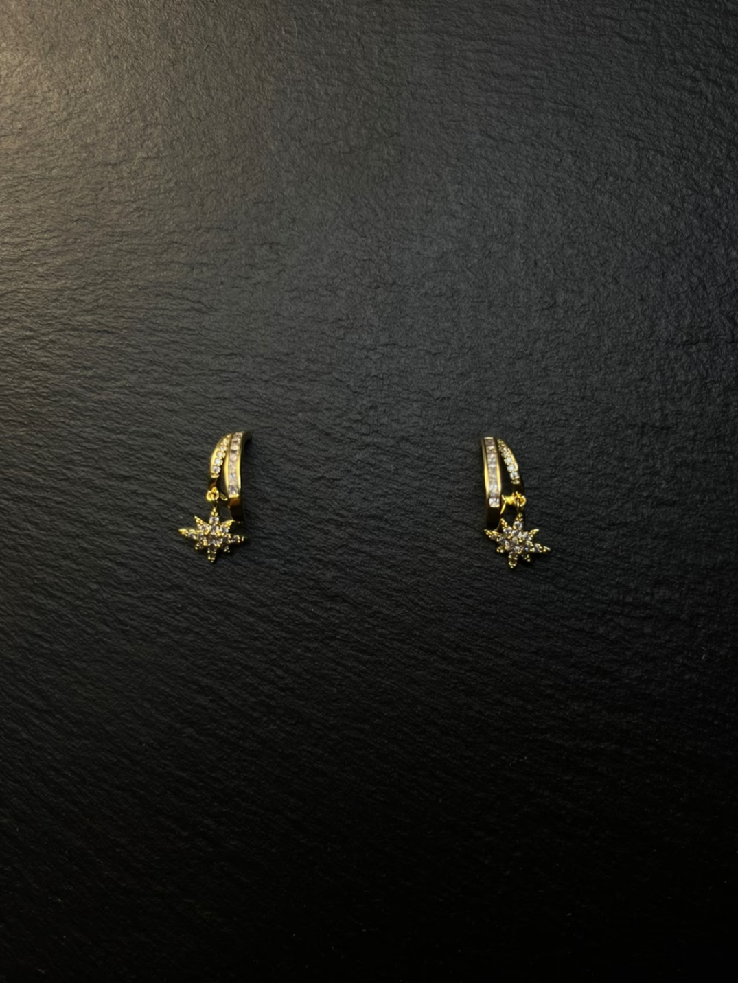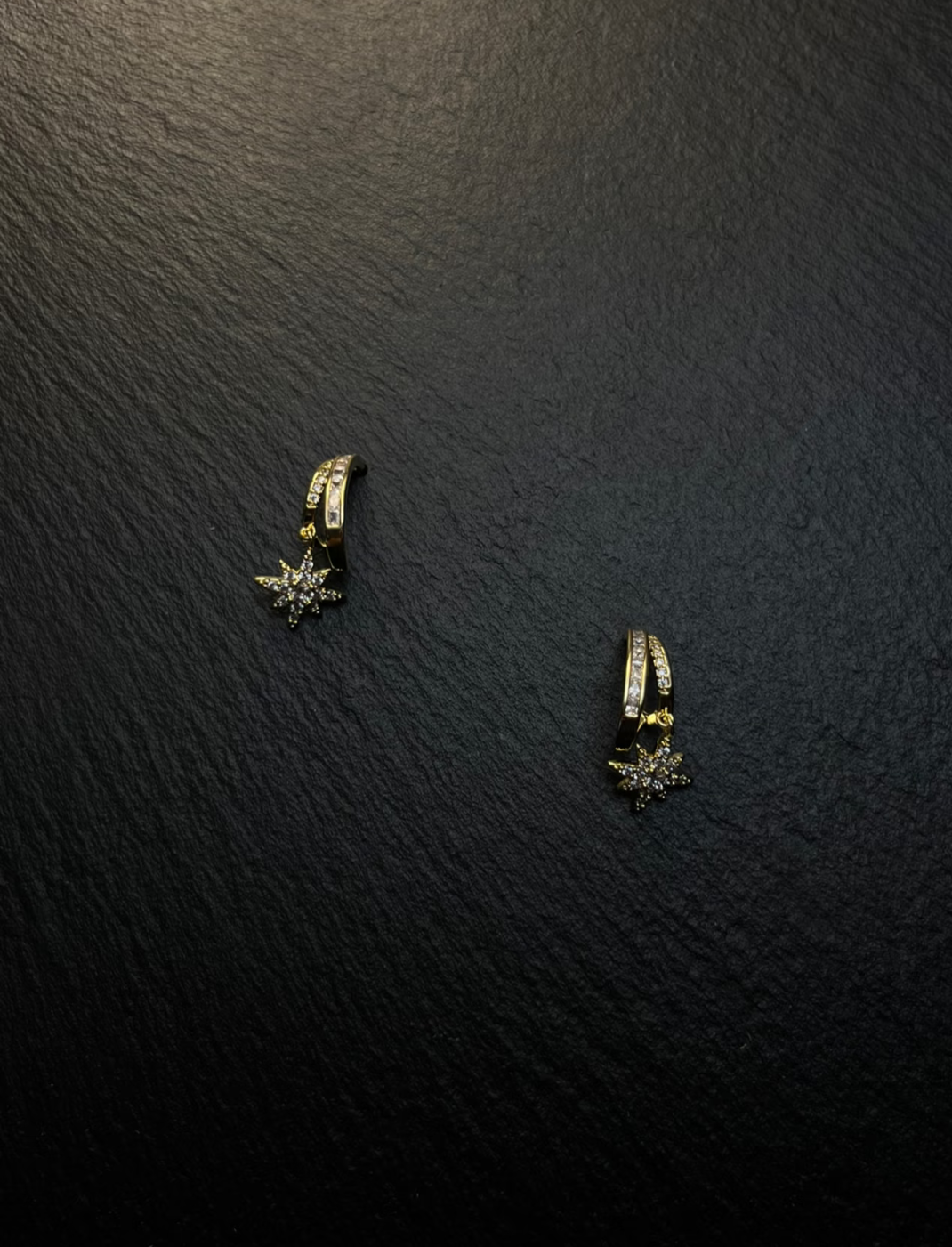 Gold huggie earrings, starburst - shaped full of diamonds. Shiny and eye - catching. Perfect for parties, music festivals, or “sweet - cool style” outfits. Become the personalized focus instantly.