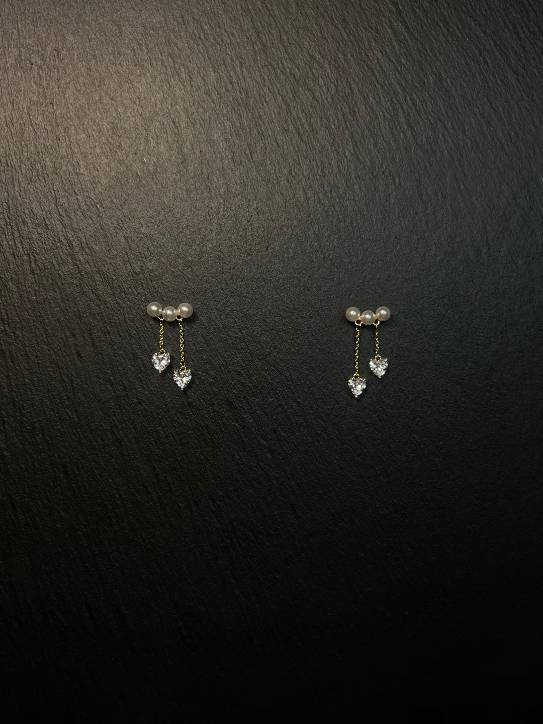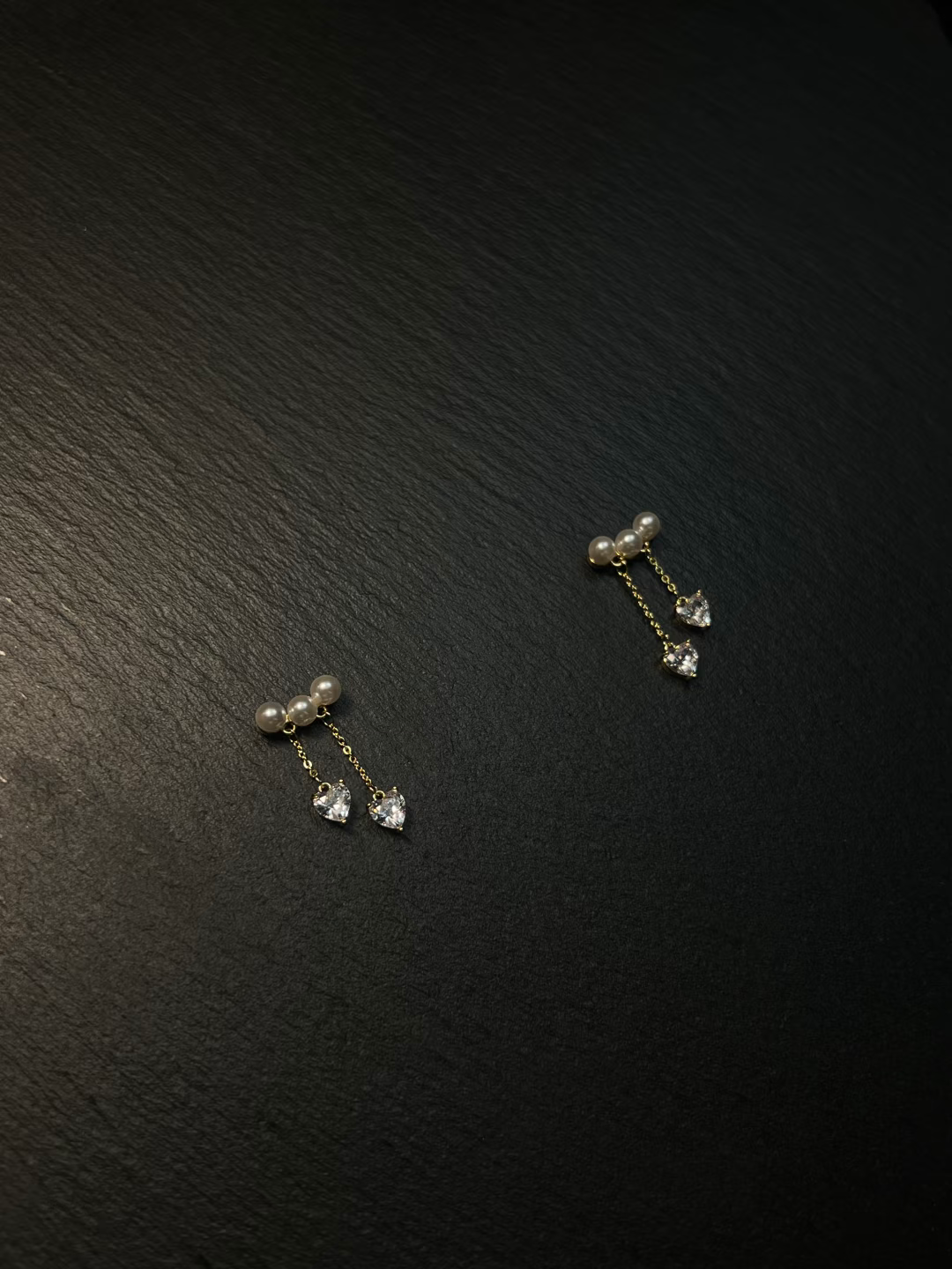 Gold - tone earrings with three tiny pearls on top. Dangling chains end in heart - shaped diamonds, blending elegance and sweetness. Perfect for adding a delicate sparkle to daily looks.